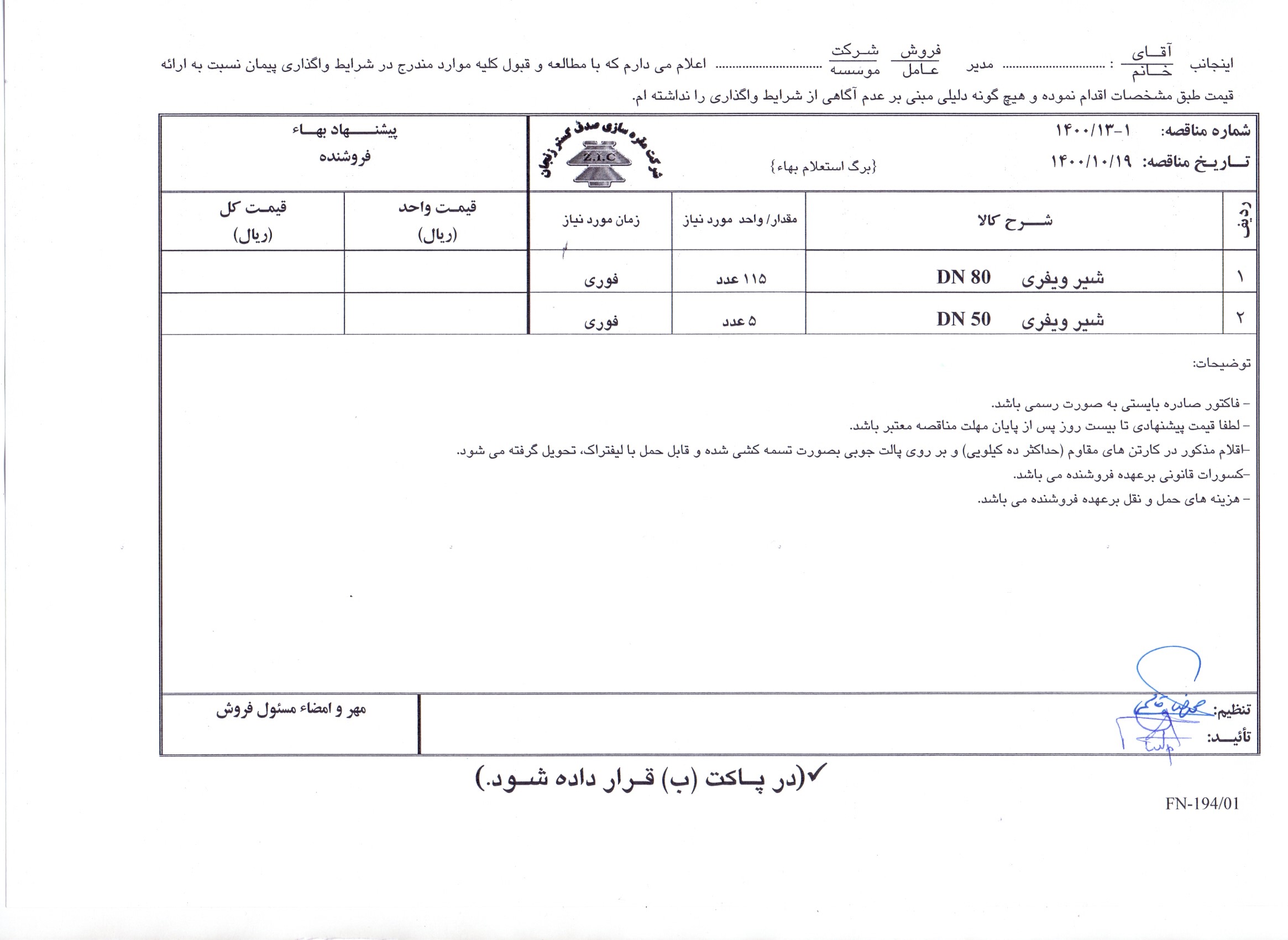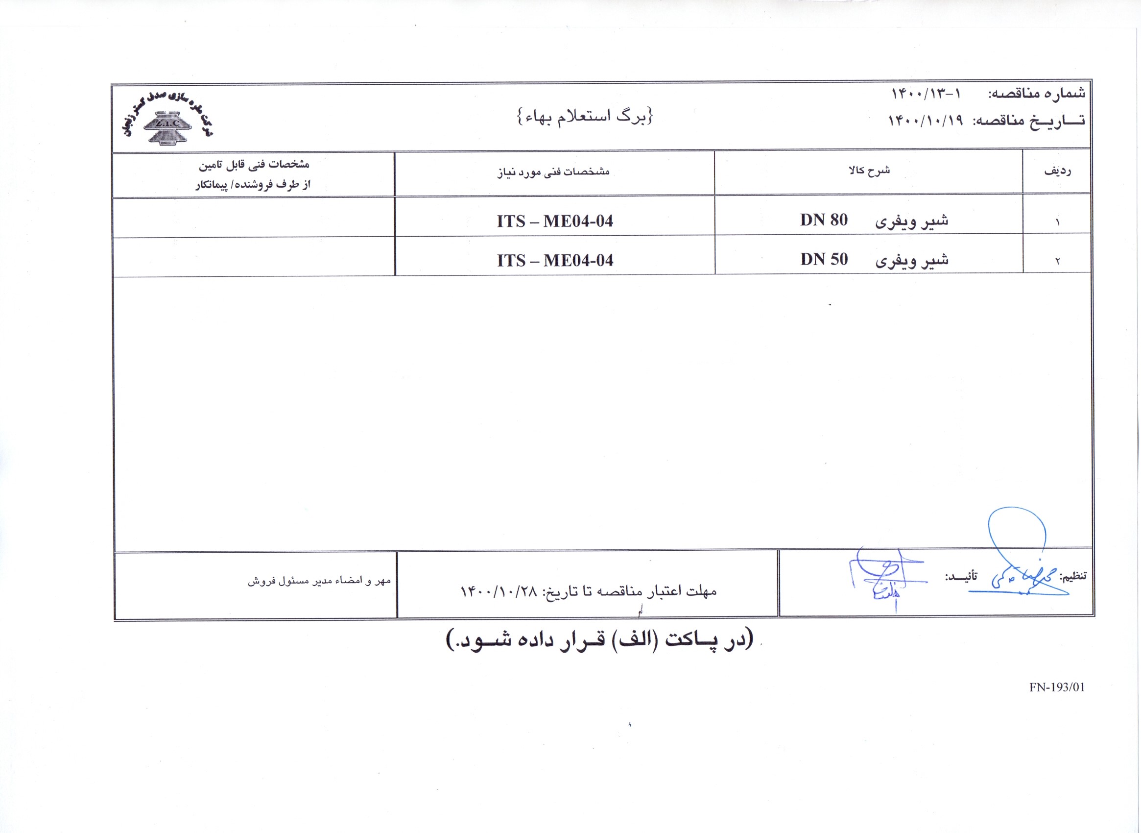 مناقصه خرید شیر ویفری DN80-DN50 / شرکت مقره سازی صدف گستر