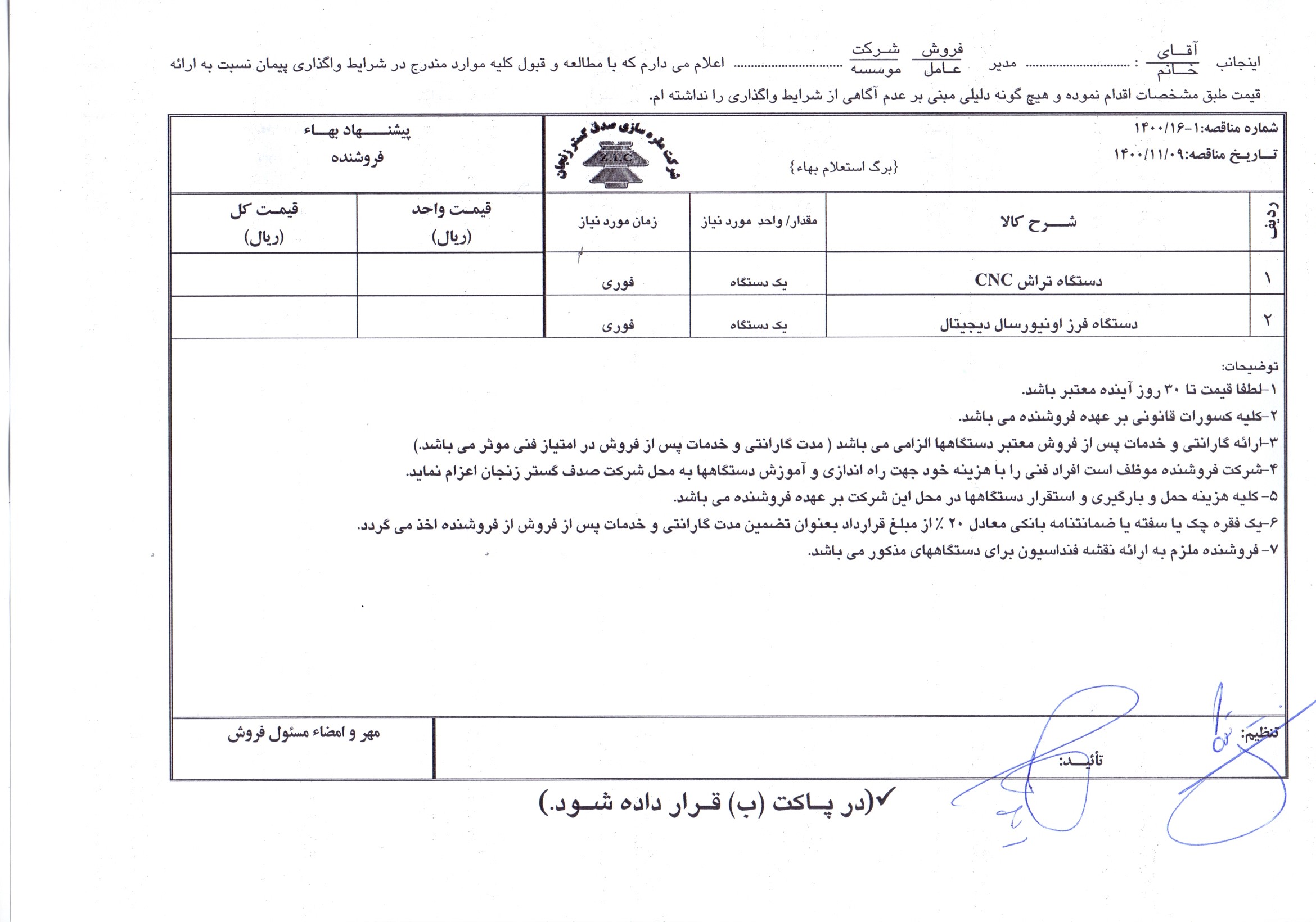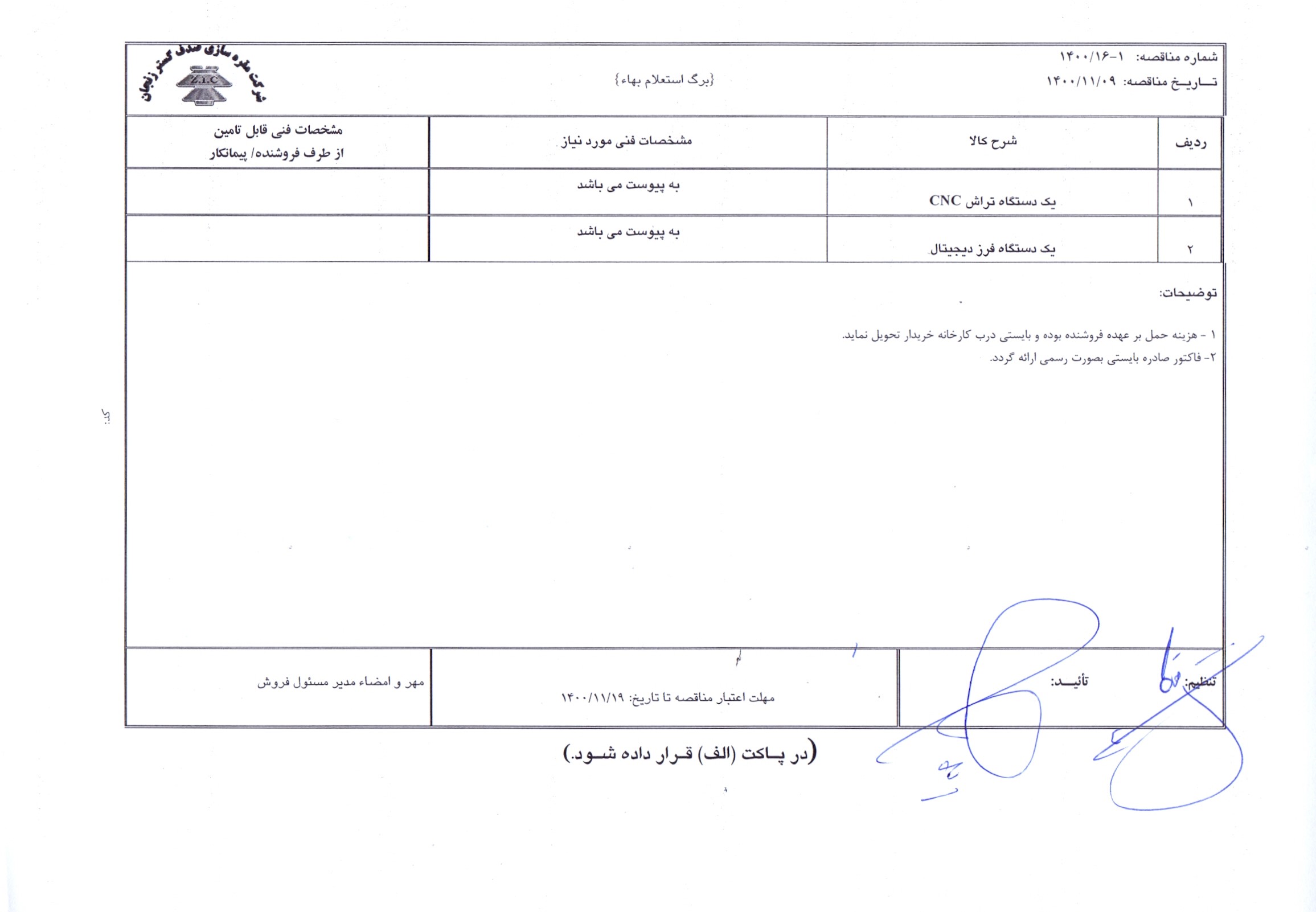 مناقصه عمومی خرید یک دستگاه تراش CNC و یک دستگاه فرز دیجیتال / شرکت مقره سازی صدف گستر